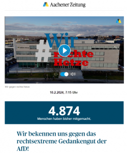 Leider stößt die Aachener Zeitung, deren Abonnent (AN) ich seit knapp 50 Jahren bin, mit ihrer Berichterstattung und Kommentierung zu den Demos, der AfD und insbesondere mit der Bekenneraktion #WirgegenrechteHetze und das angebliche „Gedankengut der rechtsextremenAfD“ in´ s gleiche präfaschistischeHorn:
