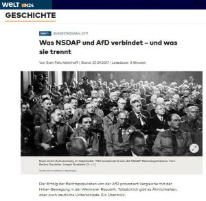 „Sie haben aber schon verstanden, dass wir die NSDAP des Jahres 1930 mit der AfD heute vergleichen, oder? Und nicht eine als Oppositionins Parlament gewählte Partei mit der Staatspartei des Drittem Reiches? Ihre WELTGeschichte“