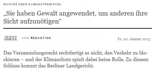 … Das Landgericht berief sich auf die Rechtsprechung des Bundesgerichtshofes, wonach Straßenblockaden grundsätzlich als Nötigung zu werten seien. In der ersten Berufungsverhandlung sagte Richter Ralf Vogl: „Sie haben Gewalt angewendet, um anderen ihre Sicht aufzunötigen.“ Das Demonstrations- und Versammlungsrecht rechtfertige keinen Eingriff in die Rechte Dritter, um politische Ziele durchzusetzen. Ziele wie der Klimaschutz spielten keine Rolle, denn nicht die Verhinderung des Klimawandels, sondern die Lahmlegung des Verkehrs sei Ziel der Gruppe gewesen. […]