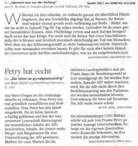 Was einige andere, u. a. Dr. Thilo Sarrazin, und ich seit Beginn der Fluchtströme über das Mittelmeer fordern, was mindestens 75% der Bevölkerung denken – die sofortige und direkte Rückführung der Menschen an den Ausgangspunkt ihrer Reise übers Meer – nimmt langsam auch in der Politik Gestalt an. Nicht weil es rechtspopulistisch, unmenschlich oder gar ein Abwehrverhalten wie bei einer Seuche wäre, wie unsere zweite Moralinstanz – direkt hinter Claudia Roth – Frau Göring-Eckart meint, …